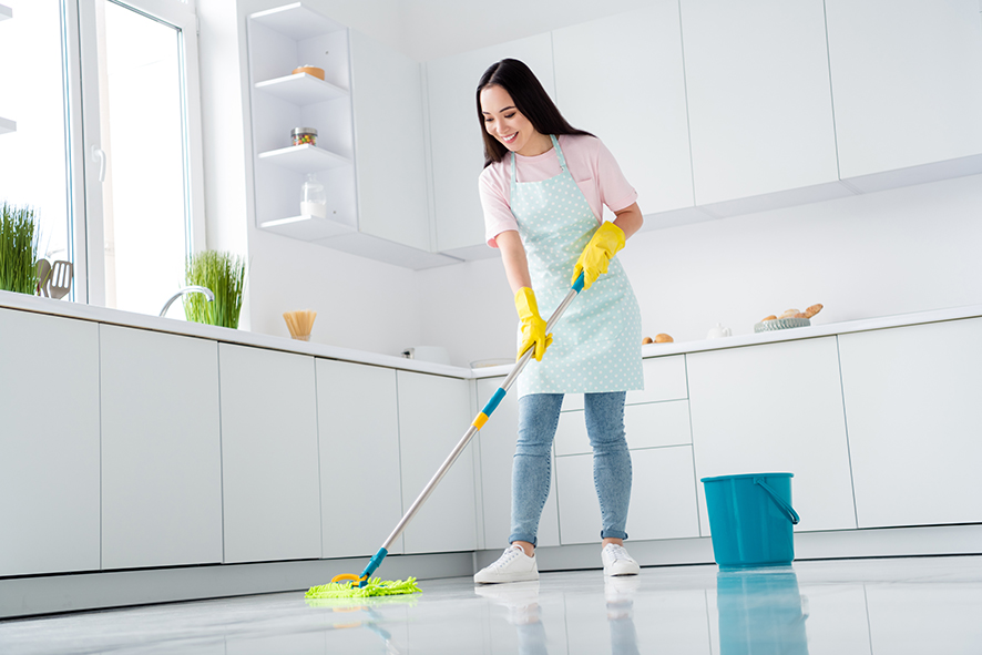 Full length body size view of her she nice attractive cheerful cheery careful girl washer wiping ceramic floor fast good service in modern white light interior style kitchen